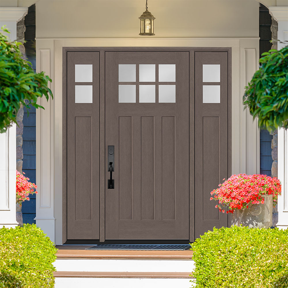 Add elegance and durability to your entryway with the Regency pre-finished fiberglass door and sidelites. It features direct glazed decorative glass. Engineered with a 3″ solid LVL door edge and polyurethane core, this fiberglass unit simulates the resonance of real wood. It is a rot-free door, protecting it against the effects of the elements.